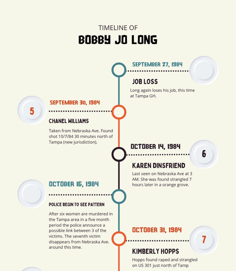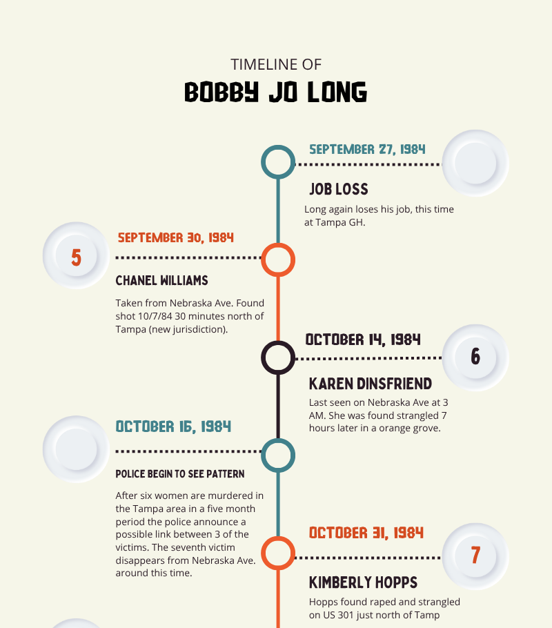 Following a job loss at Tampa GH where his ex also worked Chanel is taken on 9/30/84 (Sunday), 9 days after Elliot's is found. She was found 10/7/84 (Sunday), possibly held 7 days.