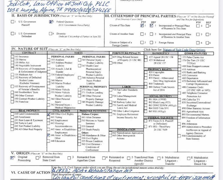 A copy of the complete lawsuit filed against the State of Texas regarding the conditions within the prisons which aims to secure his release.
